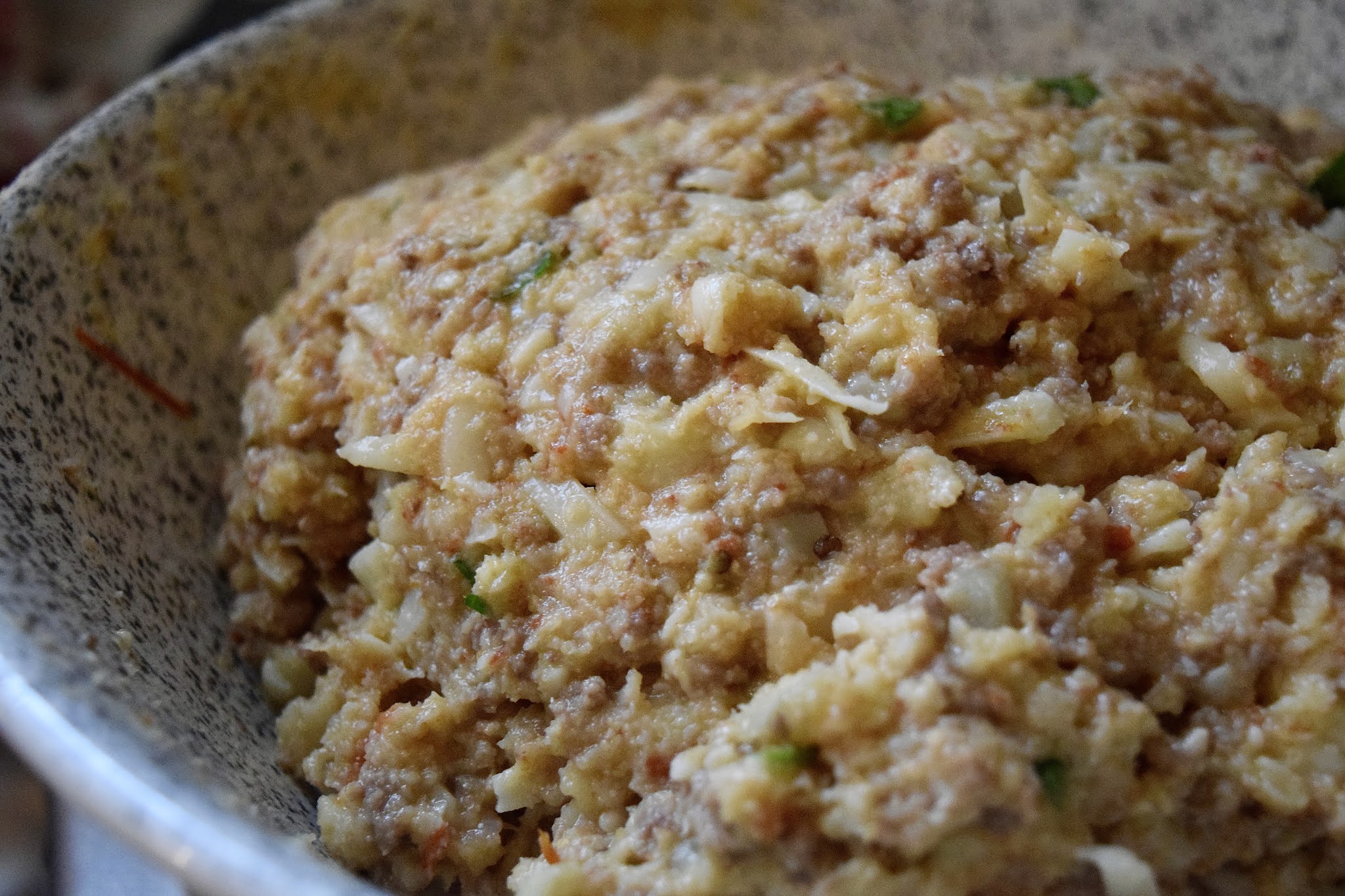 6. Meanwhile, cook the ground beef on medium in a small pot with an inch or so of water, a splash of wine or beer and a sprinkle of salt. When cooked, drain out the liquid, splash with cold water and put aside in a large mixing bowl.